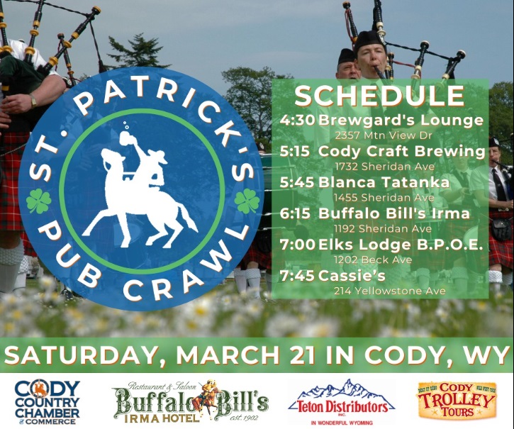 Come to the 2026 Pub Crawl in Cody, Wyoming for a drink and some Irish luck… Join the Billings Caledonian Pipes & Drums Band for this festive celebration on Saturday, March 21st! They’ll be piping & drumming across Cody’s hottest bars, lounges, and breweries starting at 4PM.