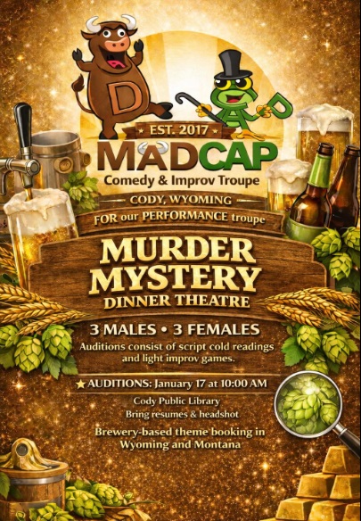 Auditions for MADCAP Comedy & Improv Troupe’s Murder Mystery/Longform Improvisation Production will occur at the Cody Library on January 17 @ 10:00am at the Cody Library. Please arrive early as the director has a few remarks he would like to share. Rehearsals will be February 21st and March 7th. Performance dates will be announced at auditions. Director will make contract offers at auditions. Cast members must have no conflicts with any rehearsal or performance dates.
