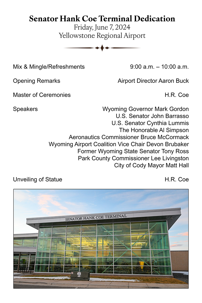 Join us at 9:00 am for a ribbon cutting ceremony for the Senator Hank Coe Terminal expansion.