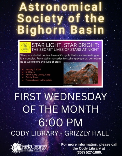 The Cody Library’s new Astronomical Society of the Big Horn Basin will meet every first Wednesday of the month at 6:00 p.m. in Grizzly Hall.