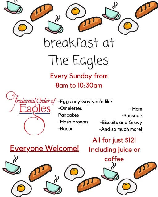 Home Breakfast at the Eagles Organizer Eagles Aerie 2426 Powell WY Location Eagles Aerie Powell 2426 131 N. Clark Street, Powell Website https://www.facebook.com/profile.php?id=100069150974025 Category Dining Date Nov 23 2025 Time 8:00 am - 10:30 am Breakfast at the Eagles Join us for breakfast at the Eagles. Cody Journal advertisers make this calendar possible. + Add to Google Calendar + iCal / Outlook export 00 days 00 hours 00 minutes 00 seconds