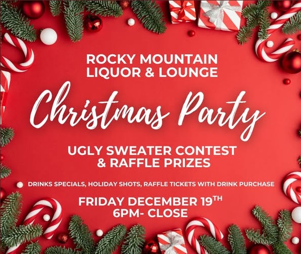 Christmas party at Rocky Mountain Liquor & Lounge- December 19thGet ready to celebrate the season with us! Join us on Friday December 19th for our annual Christmas Party- and we’re going all out this year.Ugly sweater contest with two winners & doing raffles each hour for prizes, merch, holiday gifts, and more!Holiday cocktail specials and shot specials!Come celebrate the season with Rocky Mountain Liquor!