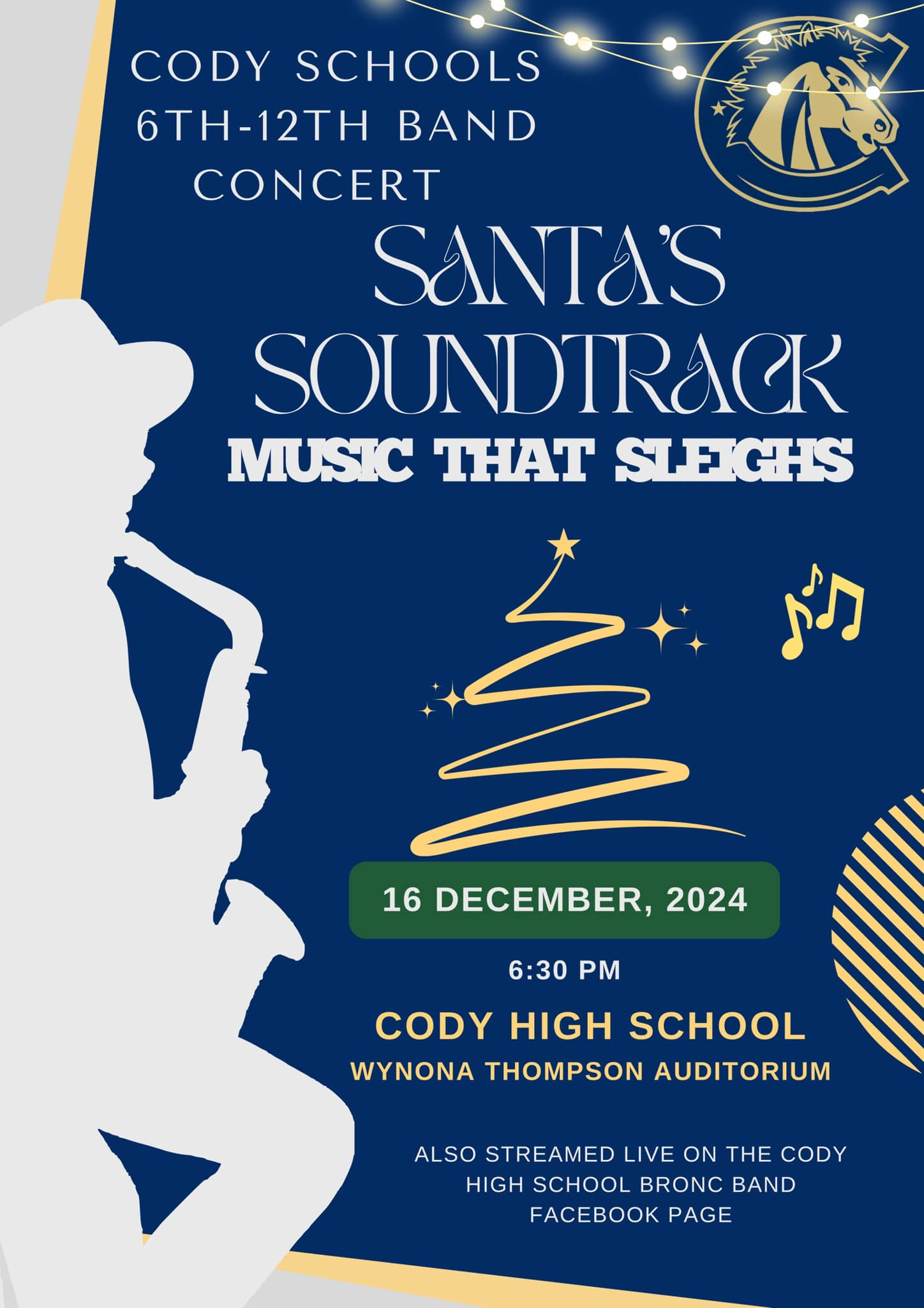 Home CHS Band Concert: Santa’s Soundtrack Organizer Cody High School Phone (307) 587.4251 Location Wynona Thompson Auditorium Wynona Thompson Auditorium | 1225 10th Street, Cody, Wyoming Website https://www.facebook.com/pages/Wynona-Thompson-Auditorium Category Cody SchoolsNight Life, Live Music & Concerts Date Dec 16 2024 Expired! Time 6:30 pm CHS Band Concert: Santa’s Soundtrack Join us Monday at 6:30pm at Cody High School! 🎵🎄😎🎅🏻🎁 Cody Journal advertisers make this calendar possible. + Add to Google Calendar + iCal / Outlook export The event is finished.