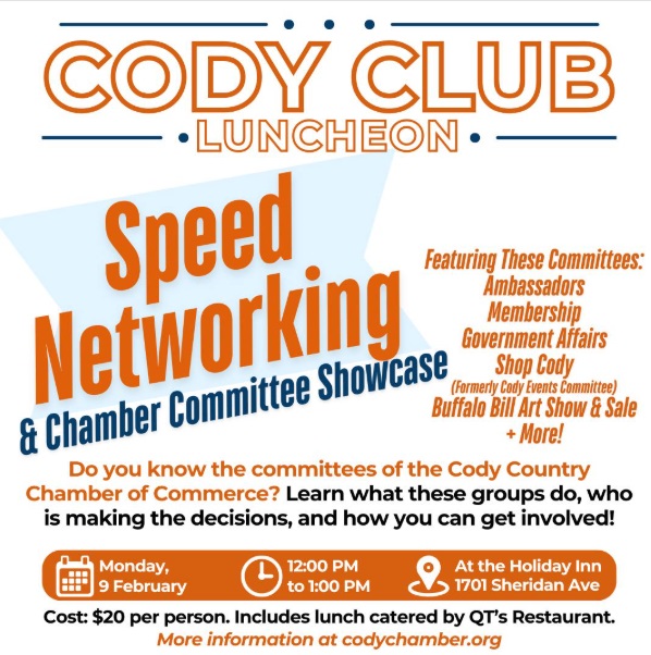 How well do you know the committees of the Cody Country Chamber of Commerce? Learn what these groups do, who is making the decisions, and how you can get involved! You’ll have a chance to meet a lot of people during this fast-paced networking event.