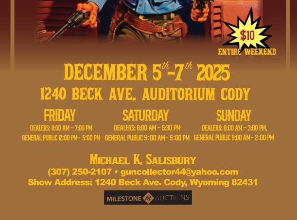 Home Cody Gun Show Location Cody Auditorium Cody Auditorium | 1240 Beck Avenue, Cody, Wyoming Category ShoppingWestern Experiences Date Dec 05 2025 Time 8:00 am - 7:00 pm Cody Gun Show The original gun show for gun dealers and general public. Cody Journal advertisers make this calendar possible. + Add to Google Calendar + iCal / Outlook export 00 days 00 hours 00 minutes 00 seconds