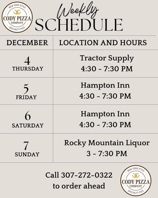 It’s almost pizza time! We’ve got a slightly altered schedule this week, so be sure to check out our dates and locations! Call 307-272-0322 to order 🍕