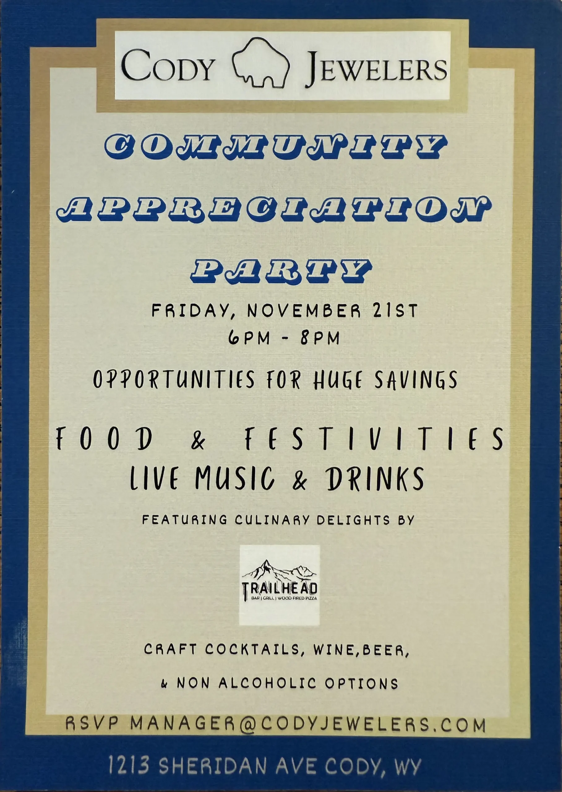 Join us at Cody Jewelers on Friday, November 21 from 6:00 – 8:00 pm for food and festivities! Culinary delights by the Trailhead!