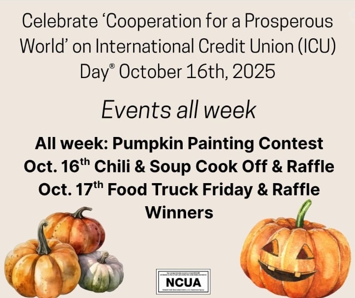 Starting on October 14th with our pumpkin painting contest (open to members of all ages!), the 16th with our very popular chili and soup cookoff and then ending on the 17th with food trucks and winners announced, it’s going to be one great time! Check back here or stop into any branch for more information.