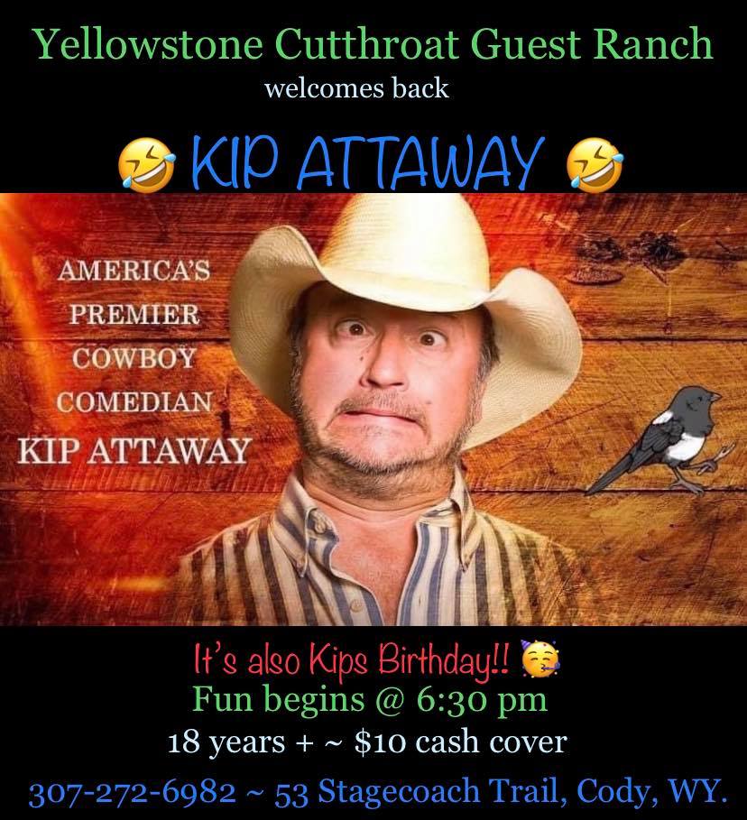 Home Cutthroat: Cowboy Comedian Kip Attaway Organizer Yellowstone Cutthroat Guest Ranch Phone 307-272-6982 Email [email protected] Website https://www.yellowstonecutthroatranch.com/ Location Yellowstone Cutthroat Guest Ranch The Cutthroat | 53 Stagecoach Trail, Wapiti, WY Website https://www.yellowstonecutthroatranch.com/ Category Night Life, Live Music & Concerts More Info Learn More Date Sep 18 2021 Expired! Time 6:30 pm Cutthroat: Cowboy Comedian Kip Attaway Cody Calendar advertisers make this calendar possible. + Add to Google Calendar + iCal / Outlook export The event is finished.