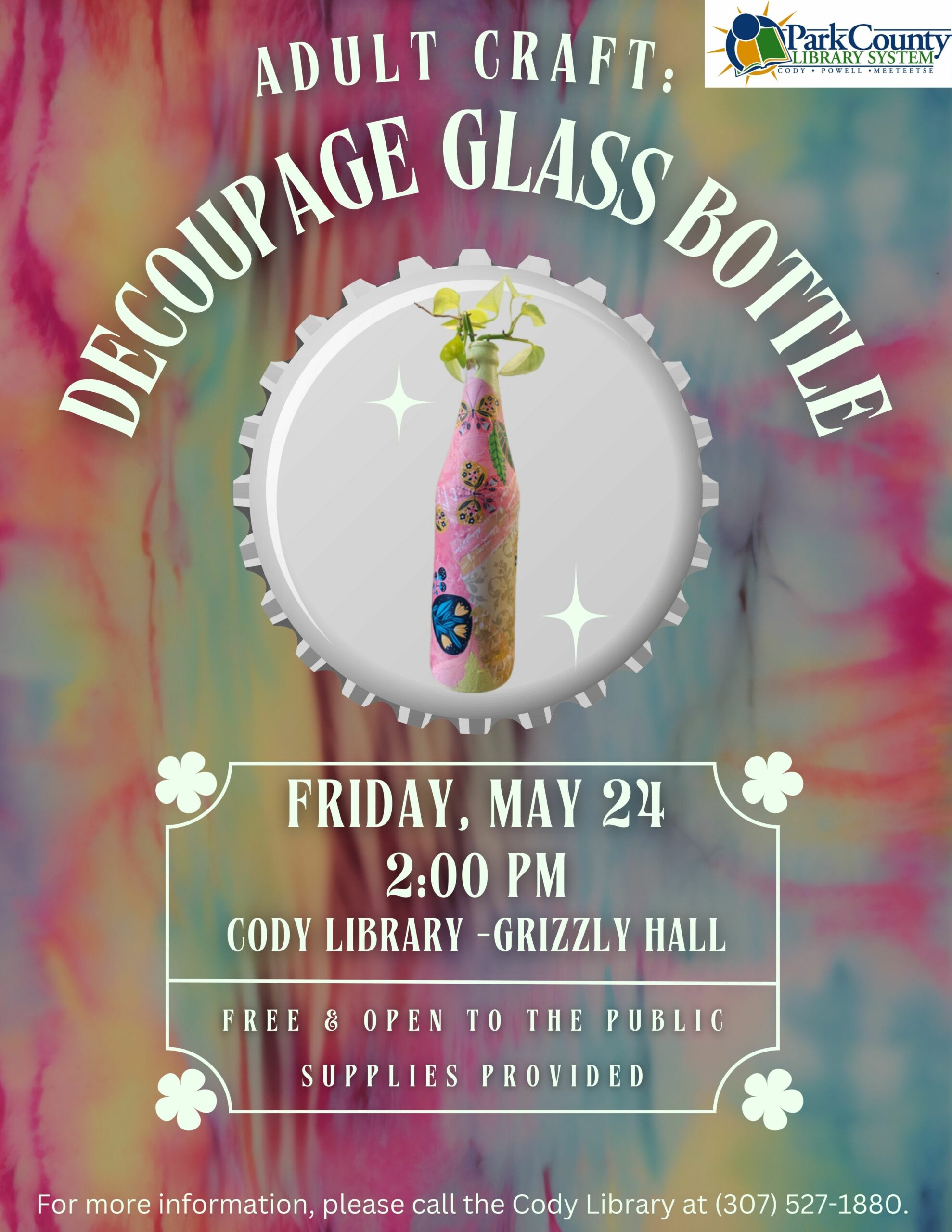 Home Decoupage Glass Bottles Organizer Park County Public Library | Cody Phone 307-527-1880 Email [email protected] Website https://parkcountylibrary.org Location Cody Library Park County Library | 1500 Heart Mountain Street Website https://parkcountylibrary.org/ Category Educational, Workshops, Classes Date May 24 2024 Expired! Time 2:00 pm Decoupage Glass Bottles Adult craft project! No sign-up is required, and all supplies are provided. Simply join us in Grizzly Hall! Cody Calendar advertisers make this calendar possible. + Add to Google Calendar + iCal / Outlook export The event is finished.