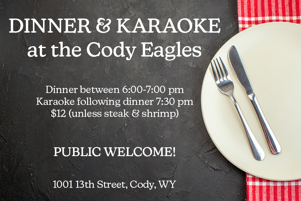 Home Dinner & Karaoke Organizer Fraternal Order of Eagles Cody 818 Phone 307-587-4573 Website https://www.facebook.com/Fraternal-Order-of-Eagles-Cody-818-227322813956013 Location Fraternal Order of Eagles Cody 818 1001 13th Street, Cody, Wyoming Website https://www.facebook.com/Fraternal-Order-of-Eagles-Cody-818-227322813956013 Category Club or GroupDiningNight Life, Live Music & Concerts Date Nov 21 2025 Time 6:00 pm Dinner & Karaoke Cody Calendar advertisers make this calendar possible. + Add to Google Calendar + iCal / Outlook export 00 days 00 hours 00 minutes 00 seconds