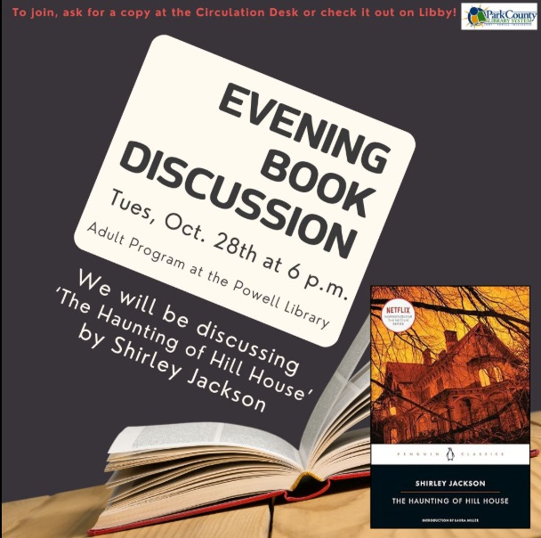 The Evening Book Discussion group will be discussing ‘The Haunting of Hill House’ by Shirley Jackson on October 28th at 6 p.m. in the Homesteader Hall Meeting Room at the Park County Fairgrounds.