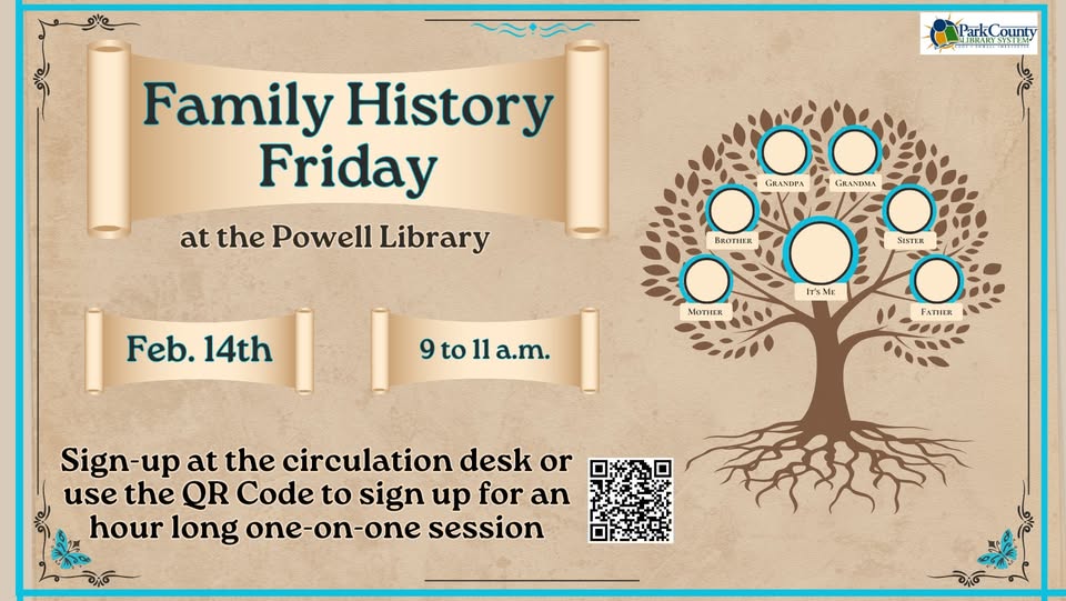 If so, the Powell Library has openings for Family History Friday on February 14th. Appointments may be made between 9 and 11 a.m. for an hour long one-on-one session with Larry and Maureen Akin!