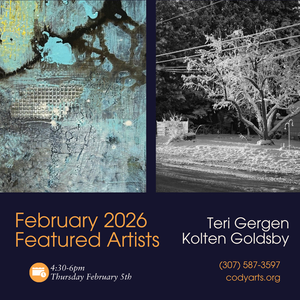 Come celebrate this month’s featured artists, Teri Gergen (painter) and Kolten Goldsby (photographer). Show hangs to the end of the month.