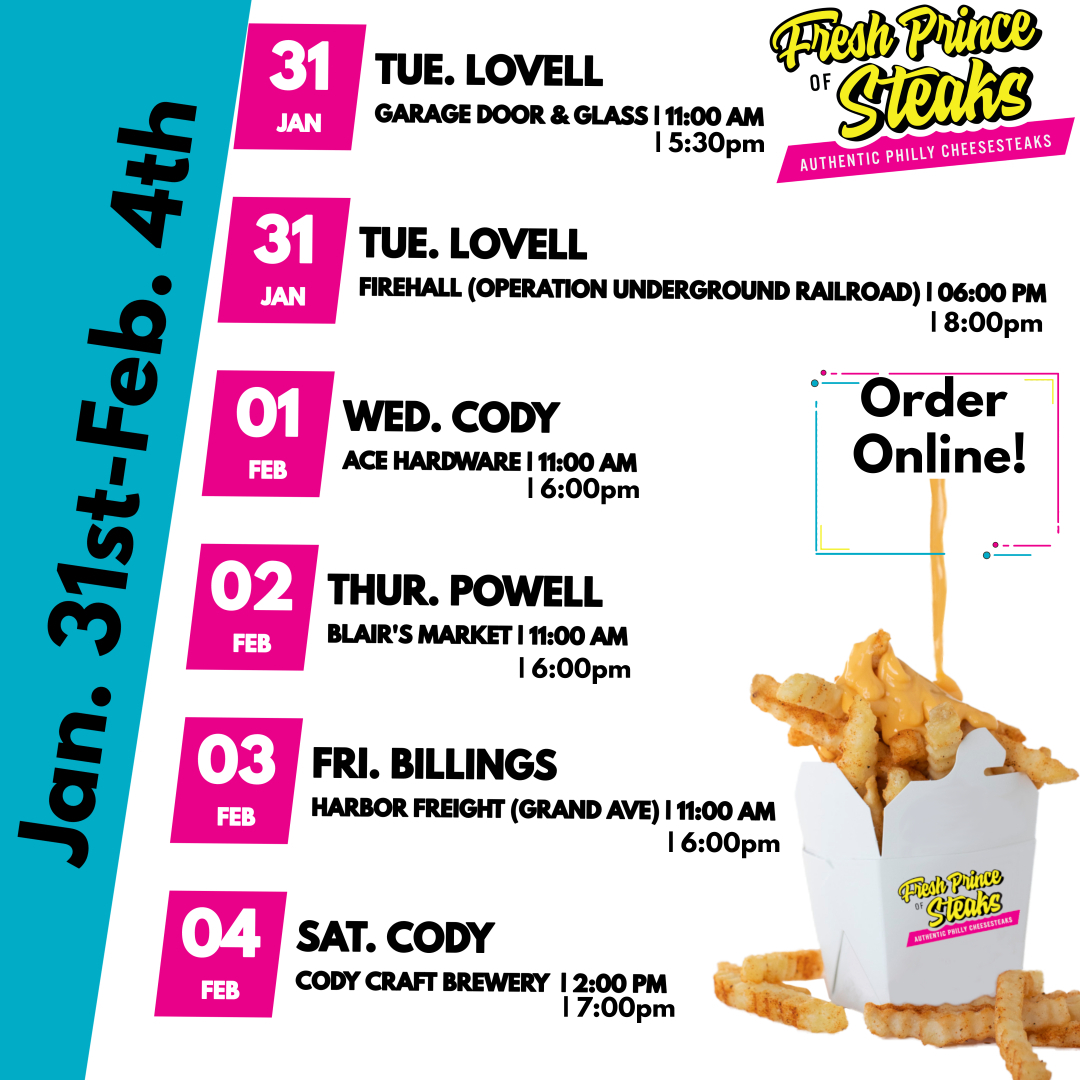 (Lovell, Cody, Powell, Billings) We’re back in town 🏘 this week. Roll on by to get your favorite authentic Philly cheesesteak