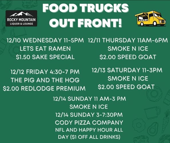 Great week of food trucks out front again! Come down and grab a meal and enjoy a drink in the lounge!