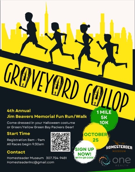 The Homesteader Museum is proud to announce the 4th Annual Jim Beavers Memorial Graveyard Gallop 10K/5K/1 mile Run/Walk to take place on October 25th, all races will begin at 9:30am.