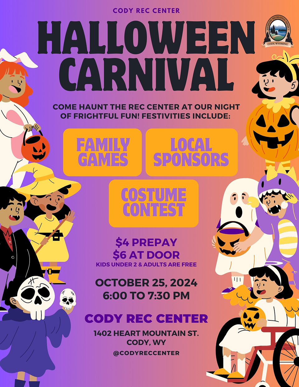 Home Halloween Carnival Organizer Paul Stock Aquatic and Recreation Center Phone (307) 587-0400 Email [email protected] Website https://codywy.gov/psarc Location Paul Stock Aquatic and Recreation Ctr Rec Center | 1402 Heart Mountain St, Cody, Wyoming Website https://www.facebook.com/codyreccenter Category Family Fun Date Oct 25 2024 Expired! Time 6:00 pm - 7:30 pm Halloween Carnival Cody Calendar advertisers make this calendar possible. + Add to Google Calendar + iCal / Outlook export The event is finished.