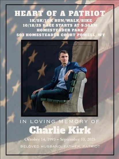 Join us in honoring Charilie Kirk’s legacy at the Heart of a Patriot 1K/5K/10K Run/Walk/Bike on Oct 18, 2025, in Powell, WY. Pre-register: https://form.jotform.com/252828151432151. Let’s keep his mission alive!