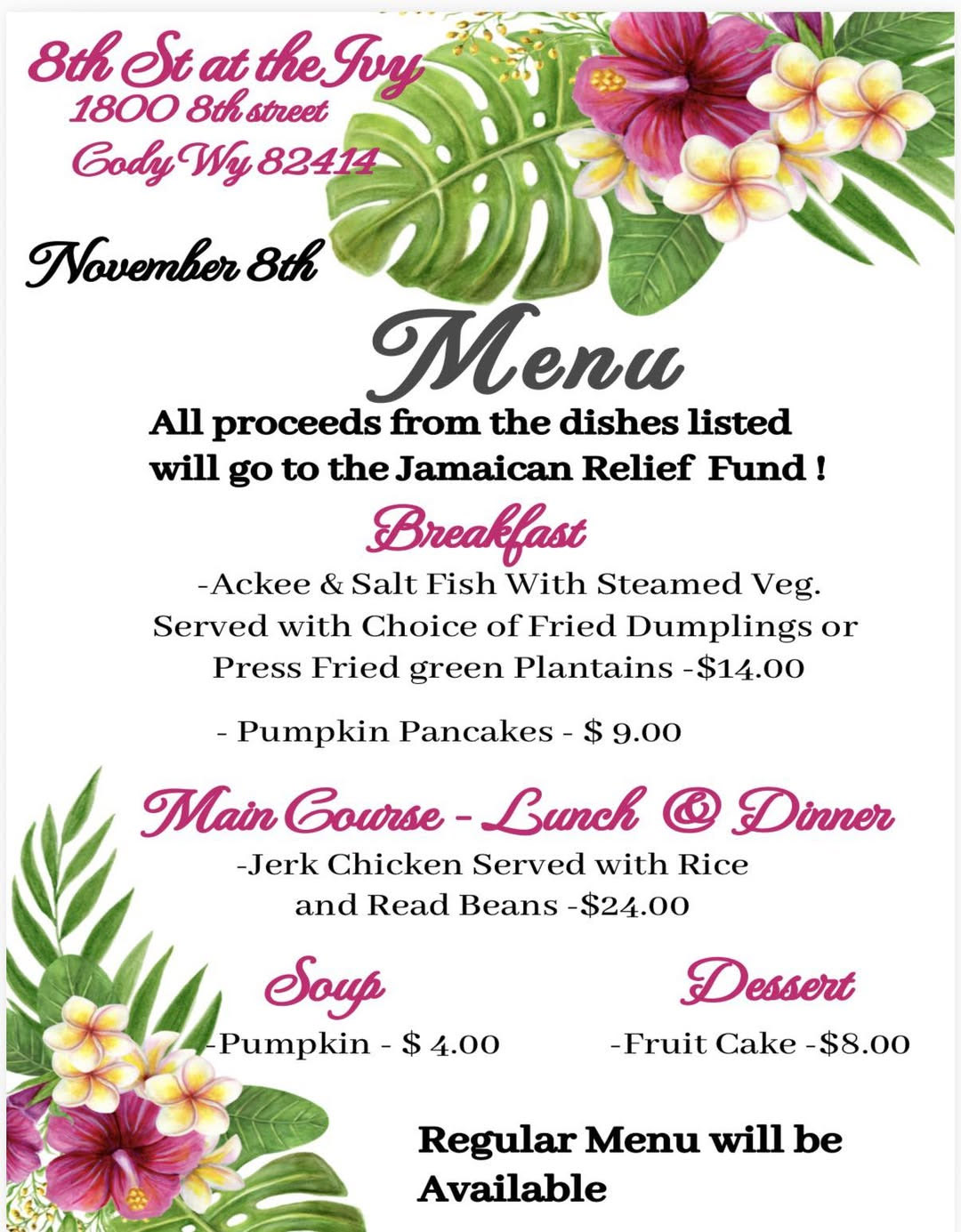 Saturday November 8th, 2025 we will be preparing a collection of traditional Jamaican dishes, crafted by our inhouse team, at the 8th Street at the Ivy restaurant. Please join us for breakfast, lunch and dinner. All proceeds from Jamaican dishes will be going towards relief for Hurricane Melissa.