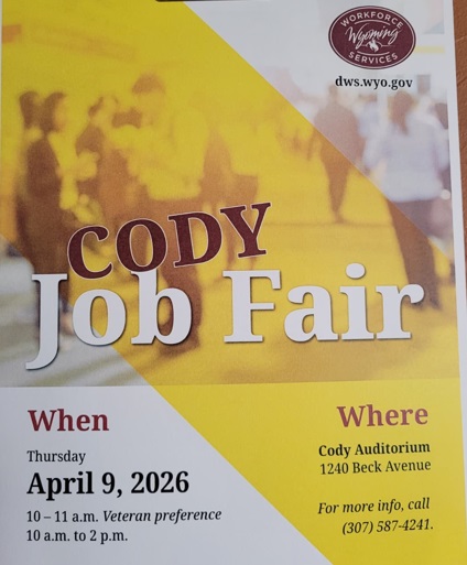 Home Job Fair Organizer Wyoming Workforce Services Website https://dws.wyo.gov/ Location Cody Auditorium Cody Auditorium | 1240 Beck Avenue, Cody, Wyoming Category Job FairsMiscellaneous Date Apr 09 2026 Time 10:00 am - 2:00 pm Job Fair Join us at the Cody Auditorium for a job fair! Cody Journal advertisers make this calendar possible. + Add to Google Calendar + iCal / Outlook export 00 days 00 hours 00 minutes 00 seconds