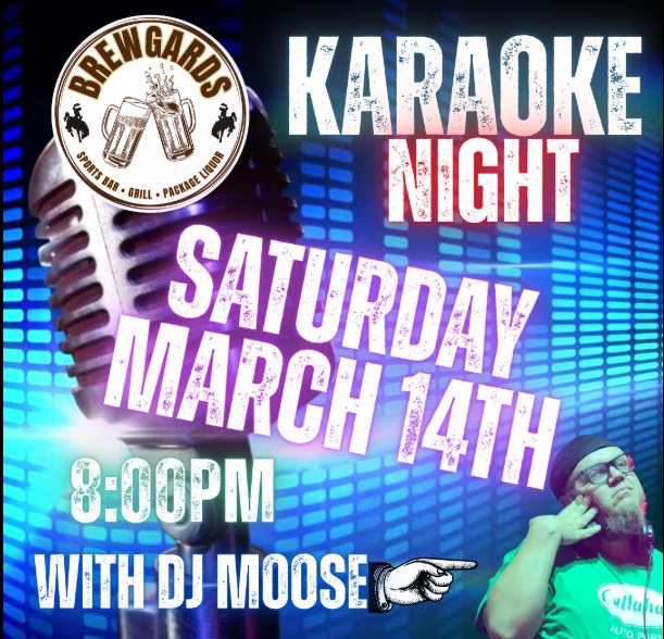 Home Karaoke w/ DJ Moose Organizer Brewgards Phone (307) 587-4431 Email [email protected] Website https://brewgardscodywyo.com%20 Location Brewgards 2357 Mountain View Rd, Cody, WY Website https://brewgardscodywyo.com%20 Phone 307-587-4431 Category Night Life, Live Music & Concerts Date Mar 14 2026 Time 8:00 pm Karaoke w/ DJ Moose TIME TO DO SOME SINGIN’ AT THE BEST BUCKIN’ BAR IN TOWN. DJ MOOSE IS SO MUCH FUN, AND OF COURSE YOU KNOW OUR SOUND SYSTEM IS THUMPIN’ COME JOIN THE FUN. Cody Journal advertisers make this calendar possible. + Add to Google Calendar + iCal / Outlook export 00 days 00 hours 00 minutes 00 seconds