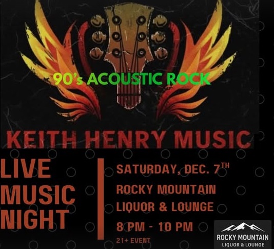 Live Music Night at Rocky Mountain Liquor & LoungeSaturday, December 7th from 8-10 PM, join us for an acoustic night with Keith Henry-Music!!He’ll be bringing in all your favorite 90’s acoustic rock hits- the perfect mix of nostalgia, good times, and live talent.Grab a drink, grab a seat, and enjoy the music!NO COVER | 21+See you Saturday night!