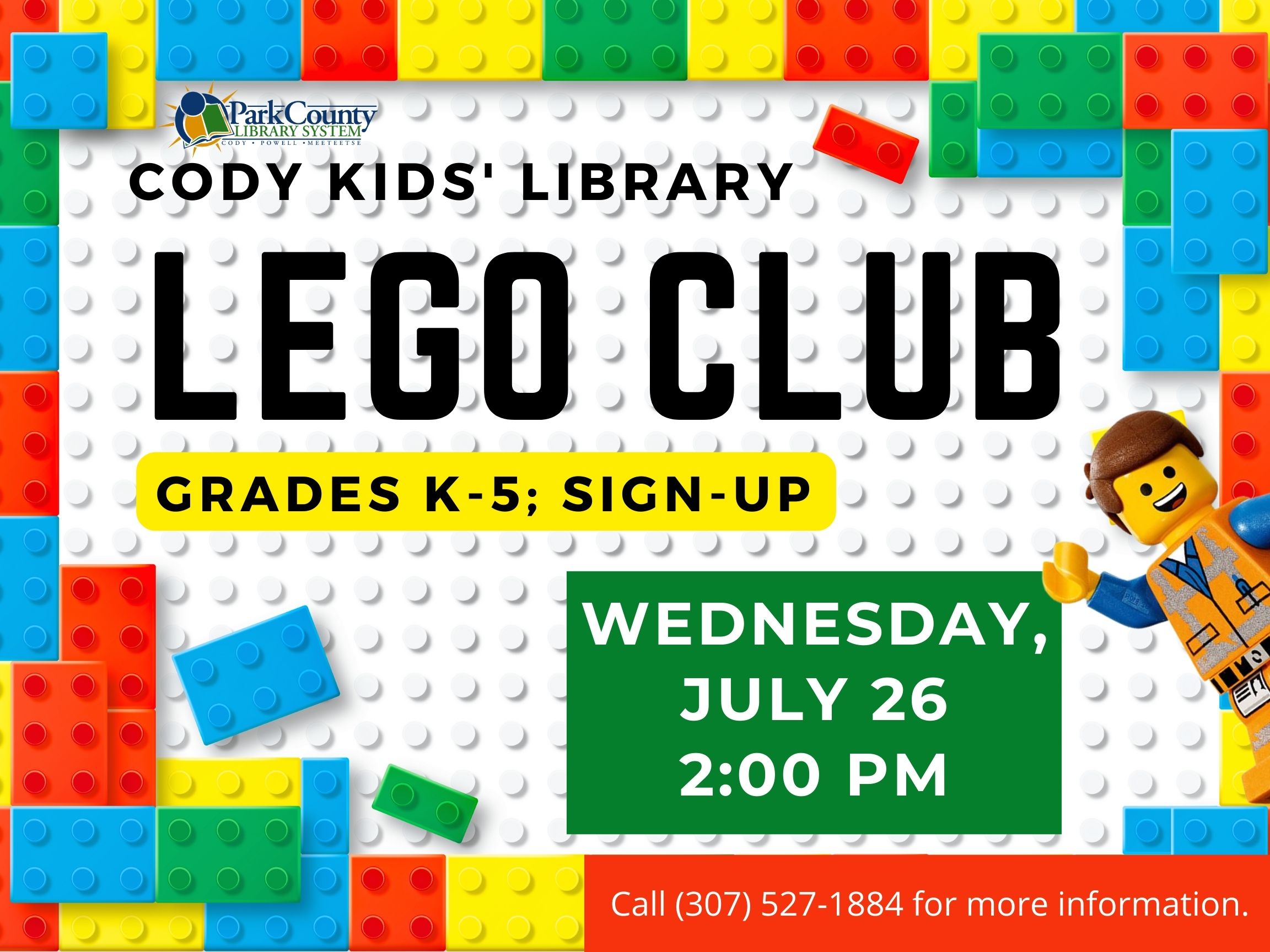 Lego Maniacs in grades K-5 are invited to come CREATE with Legos on Wednesday, July 26 at 2:00 p.m. in the Cody Kids’ Library. We supply the Legos – you supply the imagination! Sign-up is required.