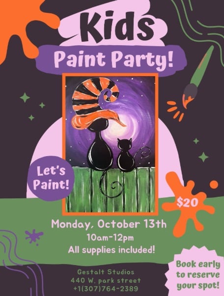 Join Gestalt Studios and 307 Art, LLC for a fun, no school day, painting party! Ana will be guiding the kids through this sweet kitty Halloween-inspired painting. All supplies are included for just $20. Spaces are limited, secure your spot today by calling (307)764-2389 or visiting our website.