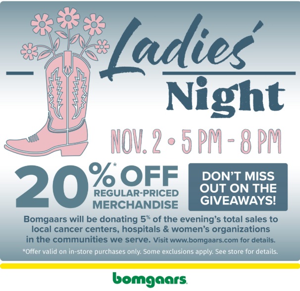 Bomgaars Ladies Night is back on Sunday, November 2, 2025, from 5–8 PM at the Cody Bomgaars store.