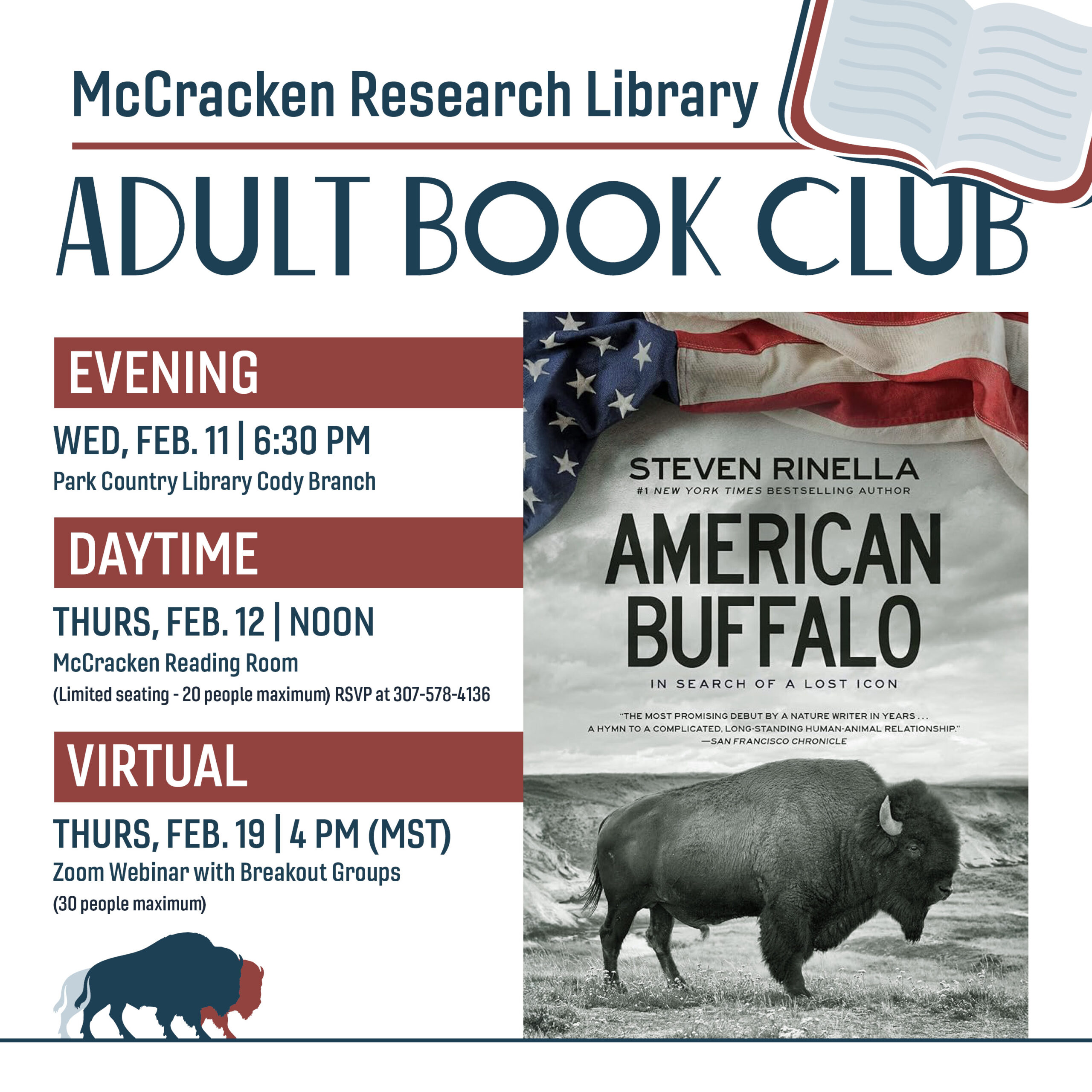 The series begins with American Buffalo: In Search of a Lost Icon by Steven Rinella, blending personal narrative and cultural history. Participants can join in person or virtually, with sessions on February 11, 12, and 19.