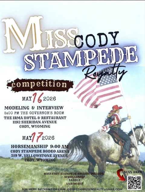 Miss Cody Stampede Royalty Competition – 2026Think you have what it takes to represent the Rodeo Capital of the World? This is your chance to step into the spotlight and become part of a proud Cody tradition.Join us for the Miss Cody Stampede Royalty Competition: May 16, 2026 – Modeling & Interview The Irma Hotel, Cody 5:00 PM May 17, 2026 – Horsemanship Cody Stampede Rodeo Arena 9:00 AMThis competition offers more than just a title — including scholarships, a saddle, and more — along with the opportunity to represent Cody and the Cody Stampede throughout the year.If you’re passionate about rodeo, community, and Western heritage, we want to see you there. For more information: [email protected] or scan the code below.