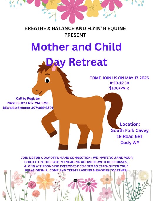 Home Mother and Child Day Retreat Organizer Flyin' B Equine Phone (307) 899-2301 Other Organizers Breathe & Balance Phone 617-794-9751 Email [email protected] Website http://www.breathenbalance.com Location 19 Rd 6Rt, Cody, WY 82414 19 Rd 6Rt, Cody, WY 82414 Category Educational, Workshops, ClassesFamily FunHealth & Fitness Date May 17 2025 Expired! Time 8:30 am - 12:30 pm Mother and Child Day Retreat Join us for a Mother and child Day Retreat. Cody Journal advertisers make this calendar possible. + Add to Google Calendar + iCal / Outlook export The event is finished.