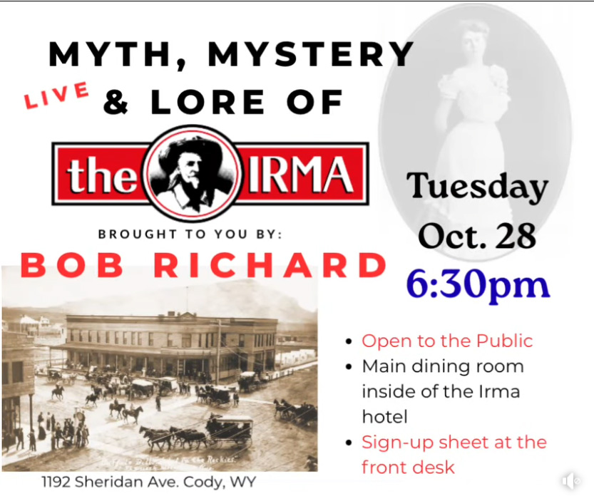 Learn about the history, the characters and the ghosts of the Irma Hotel during this free, public talk given by Bob Richard in the dining room. Sign up sheets are at the front desk.