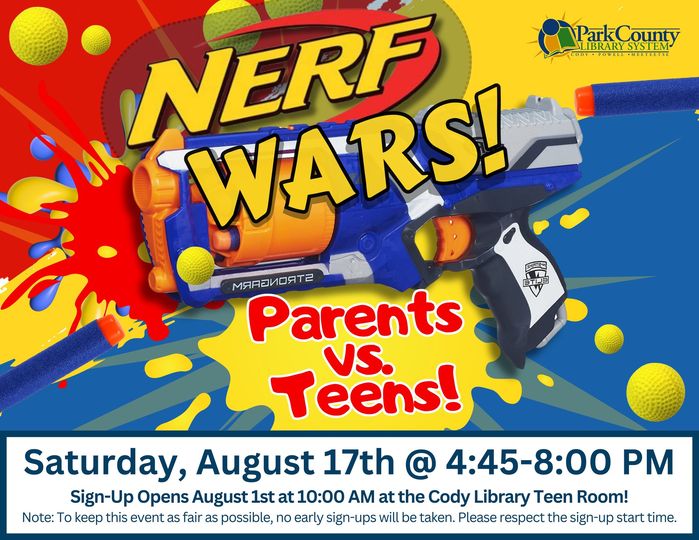Get ready for the ultimate Nerf battle at the library! This August, it’s Parents vs. Teens in an epic showdown. There are only 6 spots for teens and 6 spots for parents, so be prepared to sign up!