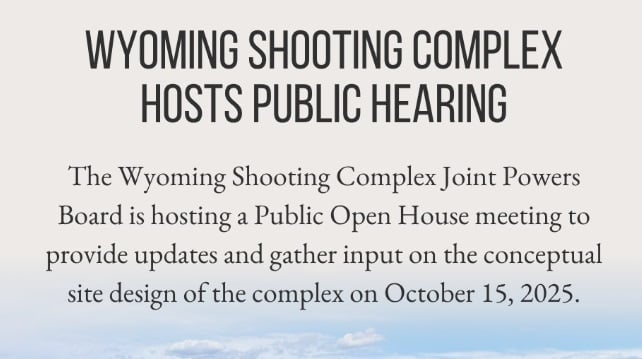 The public is invited to attend the Wyoming State Shooting Complex Joint Powers Board Meeting on October 15th. Informational update and opportunity for gathering public input on the conceptural site design of the Wyoming Shooting Complex.