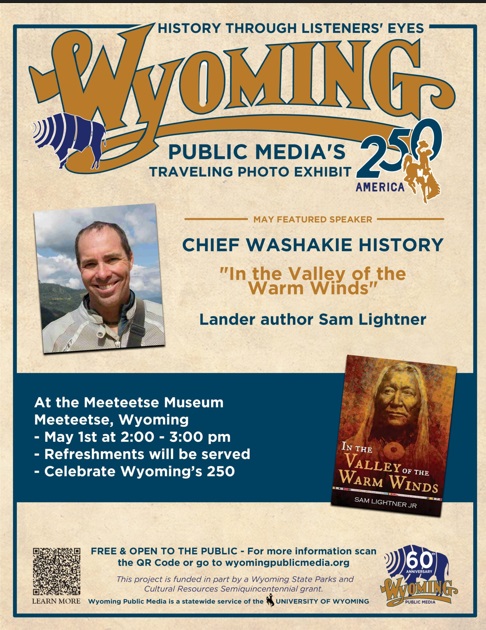 Sam Lightner, an acclaimed author and climber who has written extensively about the American West, will present on his latest book, In the Valley of the Warm Winds. The book traces the life of Eastern Shoshone Chief Washakie and explores how his leadership, diplomacy, and vision shaped Wyoming history during a pivotal era of western expansion. During the presentation, Sam will discuss the research and storytelling behind the book, including insights into the famed Crowheart Butte Battle and the larger historical figures who intersected with Washakie’s story, from Jim Bridger and Brigham Young to Crazy Horse and Abraham Lincoln. Copies of the book will be available for purchase and signing following the talk. Along with the presentation, visitors are invited to enjoy the opening reception of Wyoming’s History Through Listeners’ Eyes, a photo exhibit showcasing winning entries from Wyoming Public Media’s statewide listener photo contest. These striking images offer personal and powerful perspectives on Wyoming’s landscapes, communities, and heritage. The exhibit will be up for the entire month of May at the Meeteetse Museums. |