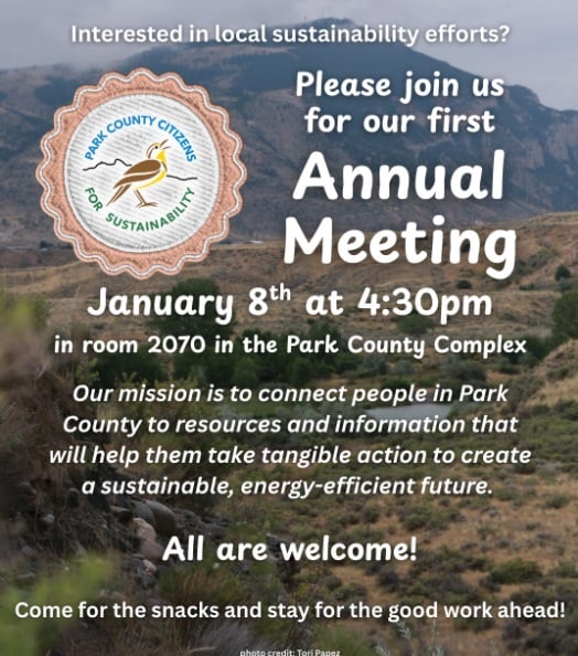 Join the Park County Citizens for Sustainability for their first annual meeting. A host will greet you at the East Door of the Park County Complex, Opposite and upstairs from the Park County Library Entrance and show you the way to our meeting room. Enjoy light refreshments. Learn more about what PCCS has been doing this year. Break into teams to brainstorm, help shape, and commit to projects for the upcoming year.