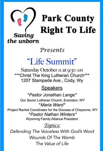 Park County Right to Life has invited three dynamic speakers to our Saturday, October 11, 2025 “LIFE SUMMIT” at Christ the King (Missouri Synod) Lutheran Church, 1207 Stampede Avenue, Cody, Wyoming.