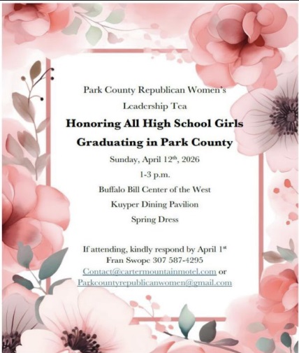 Home PCR Women’s Tea for Graduating Park County Girls Organizer Park County Republican Women Email [email protected] Location Buffalo Bill Center of the West BBCW | 720 Sheridan Ave, Cody, Wyoming Category Club or GroupFundraiser/Giving Back Date Apr 12 2026 Time 1:00 pm - 3:00 pm PCR Women’s Tea for Graduating Park County Girls Join the Park County Republican Women as they honor all girls graduating from Park County this year! Cody Journal advertisers make this calendar possible. + Add to Google Calendar + iCal / Outlook export 00 days 00 hours 00 minutes 00 seconds