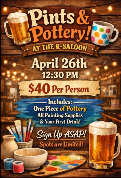 Home Pints and Pottery Organizer K-Bar Saloon Location K-Bar Saloon 219 E 1st Powell WY Category ArtEducational, Workshops, ClassesPowell Events Date Apr 26 2026 Time 12:30 pm Pints and Pottery Join us for our one of a kind Pottery Painting class! Cody Journal advertisers make this calendar possible. + Add to Google Calendar + iCal / Outlook export 00 days 00 hours 00 minutes 00 seconds