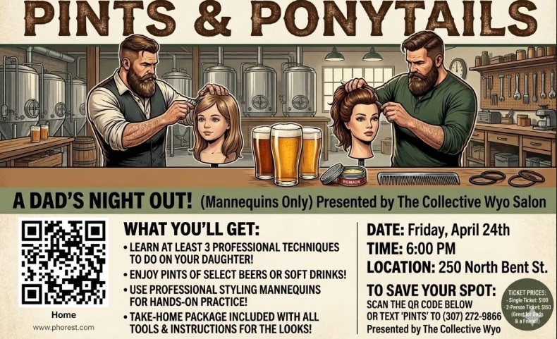Home Pints & Ponytails Location The Collective WYO Salon 250 North Bent Street Category Powell Events Date Apr 24 2026 Time 6:00 pm Pints & Ponytails Read the above information and give them a call for questions. Cody Journal advertisers make this calendar possible. + Add to Google Calendar + iCal / Outlook export 00 days 00 hours 00 minutes 00 seconds