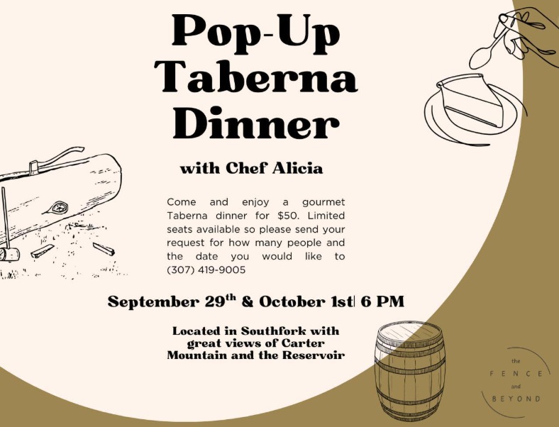Come and enjoy a gourmet Taberna Dinner by Chef Alicia for $50. Limited seats available, so please send your request for how many people and the date you would like to attend. September 29 and Oct 1.