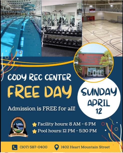 Home Rec Center Free Day Organizer Paul Stock Aquatic and Recreation Center Phone (307) 587-0400 Email [email protected] Website https://codywy.gov/psarc Location Paul Stock Aquatic and Recreation Ctr Rec Center | 1402 Heart Mountain St, Cody, Wyoming Website https://www.facebook.com/codyreccenter Category Family Fun Date Apr 12 2026 Time 8:00 am - 6:00 pm Rec Center Free Day Join us for Free Day at the Rec Center! Explore all the amenities, try something new, and see what makes our facility such a great place to move and connect. See you there! Cody Journal advertisers make this calendar possible. + Add to Google Calendar + iCal / Outlook export 00 days 00 hours 00 minutes 00 seconds