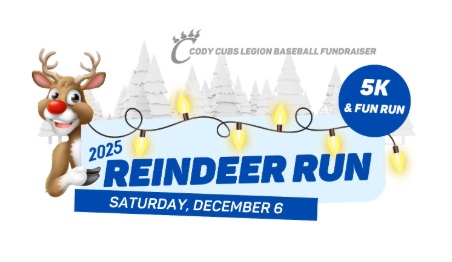Thank you for supporting your Cody Cubs Legion Baseball! This Fun Run and 5k event is a fundraiser for our baseball teams in order to support travel, gear, and operating expenses. Virtual runs are available for non-local participants or those who can’t make it on race day. Packet pickup will be Friday, Dec 5 from 4-6pm and before the race on Saturday, Dec 6 from 4-4:30pm. The 1 mile FUN RUN will begin at 5pm with the 5k following at 5:30pm. Results will be displayed by age groups and prizes given for largest “teams.” So get your friends together and join a team!! (We have pre-selected teams setup or you can create your own for your crew.) Holiday attire, antlers, elf hats, “glow” accessories, and more are highly encouraged! (We will have some glow necklaces, bracelets, etc available to first come first serve.) Have fun and THANK YOU again for your support!