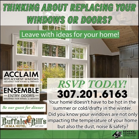 Home Renewal By Anderson of Wyoming Dinner Organizer Renewal By Anderson of Wyoming Phone 307-215-7489 Location The Irma Hotel The Irma Hotel | 1192 Sheridan Avenue, Cody, WY Website https://www.irmahotel.com/ Category DiningMiscellaneous Date Apr 14 2026 Time 6:00 pm - 8:00 pm Renewal By Anderson of Wyoming Dinner Be our guest for dinner & leave with ideas for your home!! When: April 14th 6-8pm OR April 15th 6-8pm Where: Buffalo Bill’s Restaurant & Salon @ Irma Hotel 1192 Sheridan Ave, Cody, WY 82414 Cody Journal advertisers make this calendar possible. + Add to Google Calendar + iCal / Outlook export 00 days 00 hours 00 minutes 00 seconds