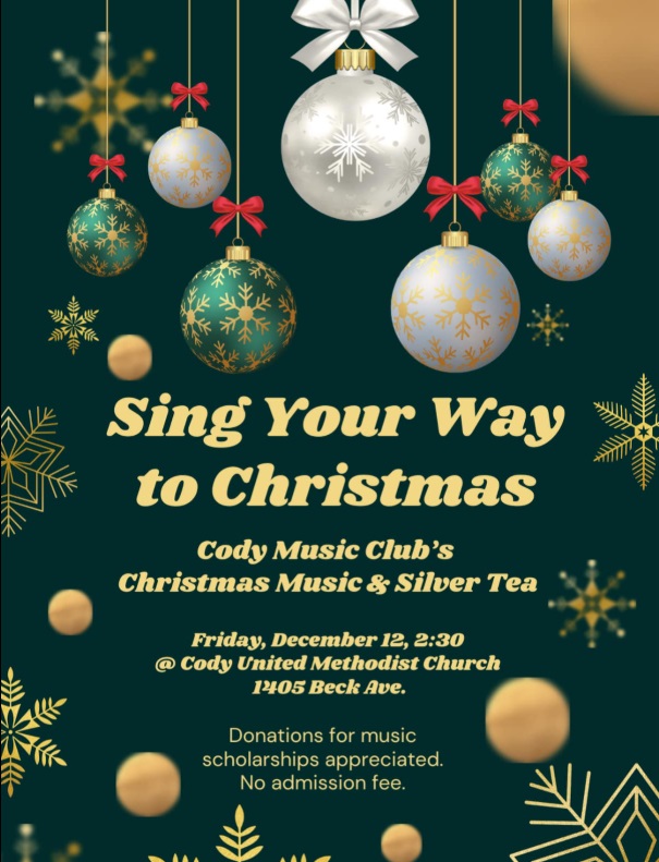 Home Sing Your Way to Christmas Organizer Cody Music Club Website https://www.facebook.com/Cody-Music-Club-100225601906055/ Location United Methodist Church 1405 Beck Ave, Cody, WY Website https://www.codyumc.com/ Category Club or GroupFamily FunHoliday Event Date Dec 12 2025 Time 2:30 pm Sing Your Way to Christmas Come join us for music and silver tea! Cody Journal advertisers make this calendar possible. + Add to Google Calendar + iCal / Outlook export 00 days 00 hours 00 minutes 00 seconds