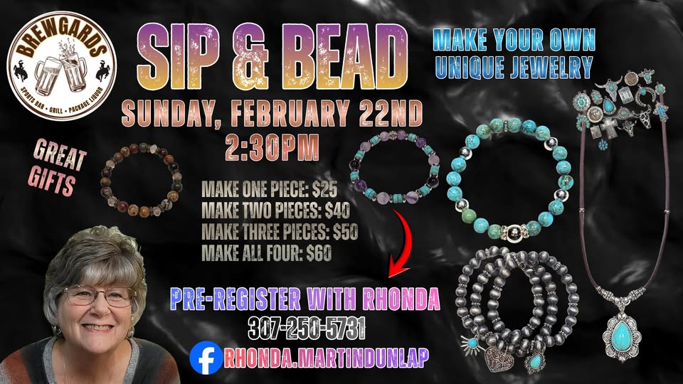 PRE-REGISTER WITH RHONDA DUNLAP BY PHONE OR MESSAGE ON FACEBOOK. SIGN UP TODAY FOR A FUN DAY OF MAKING YOUR OWN JEWELRY IN BREWGARDS INCREDIBLE FRIENDLY ATMOSPHERE. HAVE SOME LUNCH, SOME DRINKS AND WALK AWAY WITH YOUR OWN UNIQUE PIECES.