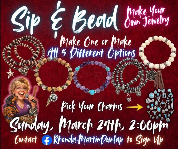 Must sign up through Rhonda Dunlap prior to the class and tell her which bracelets you want to make. www.facebook.com/rhonda.martindunlap