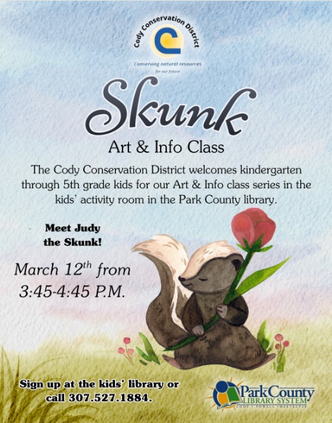 Thursday afternoon, March12th at 3:45, the Cody Conservation District is leading a fascinating program on skunks, combining art with information for kids in grades K-5! Our favorite live skunk Judy will be here!! Please sign up.